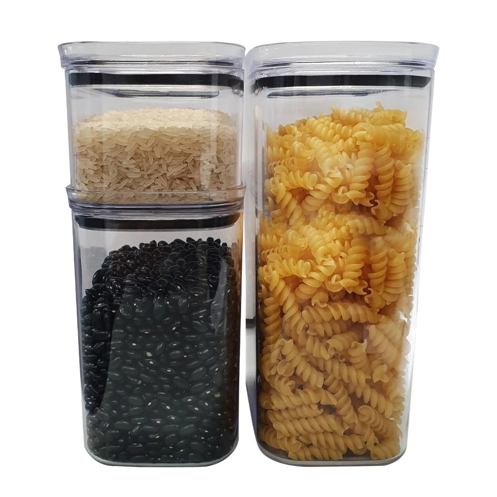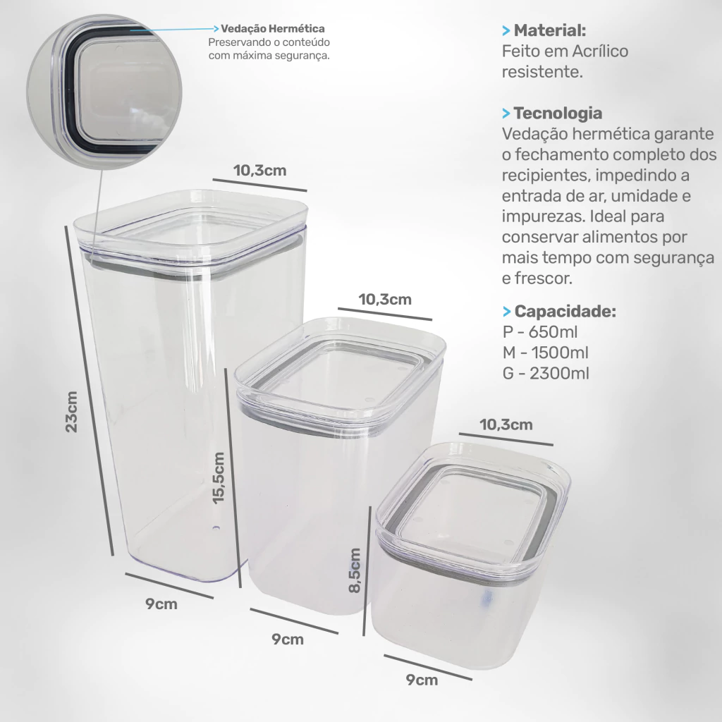 Produzidos em PS transparente (acrílico de alta qualidade), os potes possuem tampas com vedação hermética que impedem a entrada de ar e umidade, garantindo alimentos sempre frescos por muito mais tempo. O design moderno e empilhável facilita o uso no dia a dia, otimizando espaço em armários, geladeiras ou despensas.